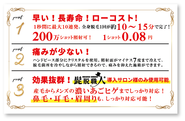 脱毛効果が高く、施術時間も短く済むのでお客様からお喜びの声をたくさん頂くようになりました!